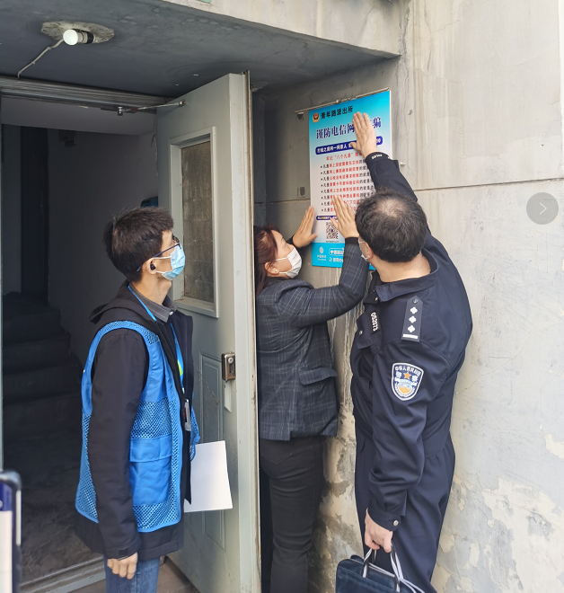 青年路派出所社区民警结合辖区老旧小区居多,居民多为中老年群体,积极对应各自社区主任,利用每月社区工作会议,积极发动群防群治“红袖标”,平安志愿者,居委会主任,制作通俗易懂的反诈宣传提示牌,利用小区电梯广告位,楼宇单元门口,小区宣传栏等阵地,广泛张贴,将反诈宣传受众范围从线上延伸到了线下中老年人等智能手机覆盖率低的群体,切实消除电信诈骗的隐患和工作漏洞,密切警民关系,实现共建共治共享。