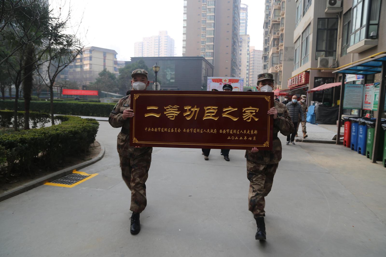 在南二环天伦御城龙脉小区,大门悬挂的“热烈庆贺刘联恒同志荣立个人二等功”横幅下,区人武部把二等功之家的牌匾递到刘联恒手中,小区里前来祝贺的上百名群众顿时响起了阵阵掌声,军嫂薛薇手捧丈夫的二等功军功章脸上洋溢着幸福的微笑,在场的群众纷纷拿起手中的手机抢拍镜头,分享功臣之家的荣光时刻。同一天,桃园街道武装部在双府社区为现役军人朱建平家属送去了三等功喜报和慰问金。