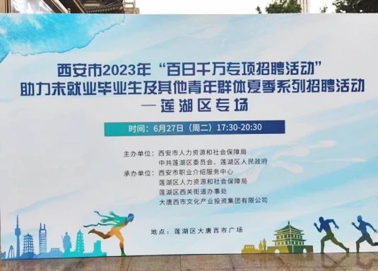 为进一步促进高校毕业生等青年群体就业,畅通求职招聘渠道,促进人岗精准匹配。6月27日,莲湖区人社局联合市职介中心在大唐西市广场组织开展“职引未来筑梦青春”西安市2023年“百日千万专项招聘活动”莲湖专场。