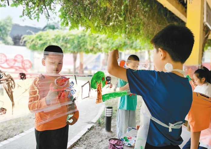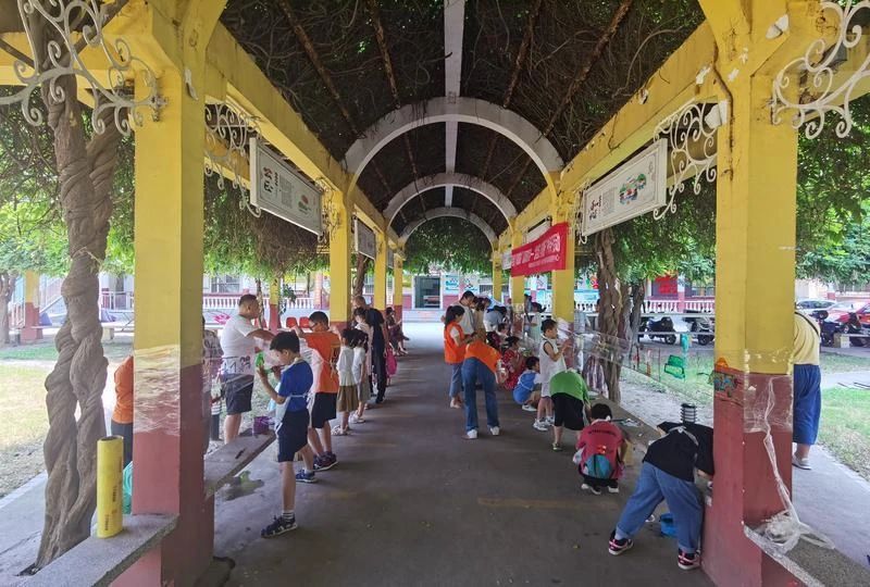 长廊边绿草茵茵,长廊内凉风习习,孩子们拿起画笔,托起调色板,沐浴在好景致中聚精会神作画。翠绿的竹子、憨厚的熊猫、红彤彤的太阳……孩子们用画笔描绘天马行空的想象,也描绘出心中的美丽世界。平淡无奇的百米保鲜膜成了色彩斑斓的彩条,不时有居民驻足观赏,为孩子们的绘画能力点赞。