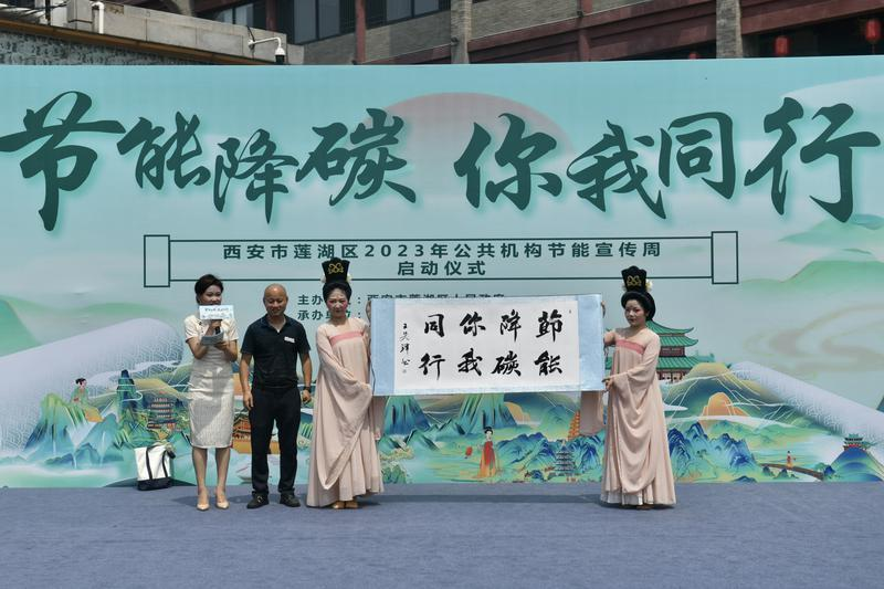启动仪式上,舞蹈、武术、独唱精彩纷呈,莲湖区书法家协会主席现场题字,挥毫写下今年节能宣传周的主题“节能降碳你我同行”,以此号召绿色低碳的生活理念贯穿到每个人的生活中。同时,本次活动还将节能宣传与古代传统文化相结合,以拍照打卡、游戏答题、兑换奖品等更富创意的形式,让市民游客了解到绿色低碳生活的重要意义。