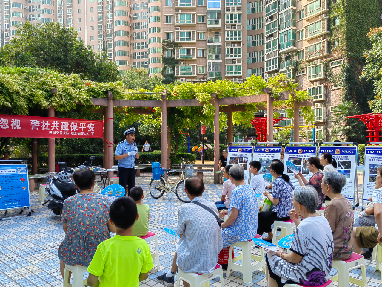 为进一步提高广大群众“知危险,会避险”的交通安全出行意识、规则意识、法治意识和文明意识,预防和减少道路交通事故的发生,8月16日,西安公安交警莲湖大队民警走进旭景名园社区,开展“交通安全勿忽视警社共建保平安”文明交通主题宣传活动。