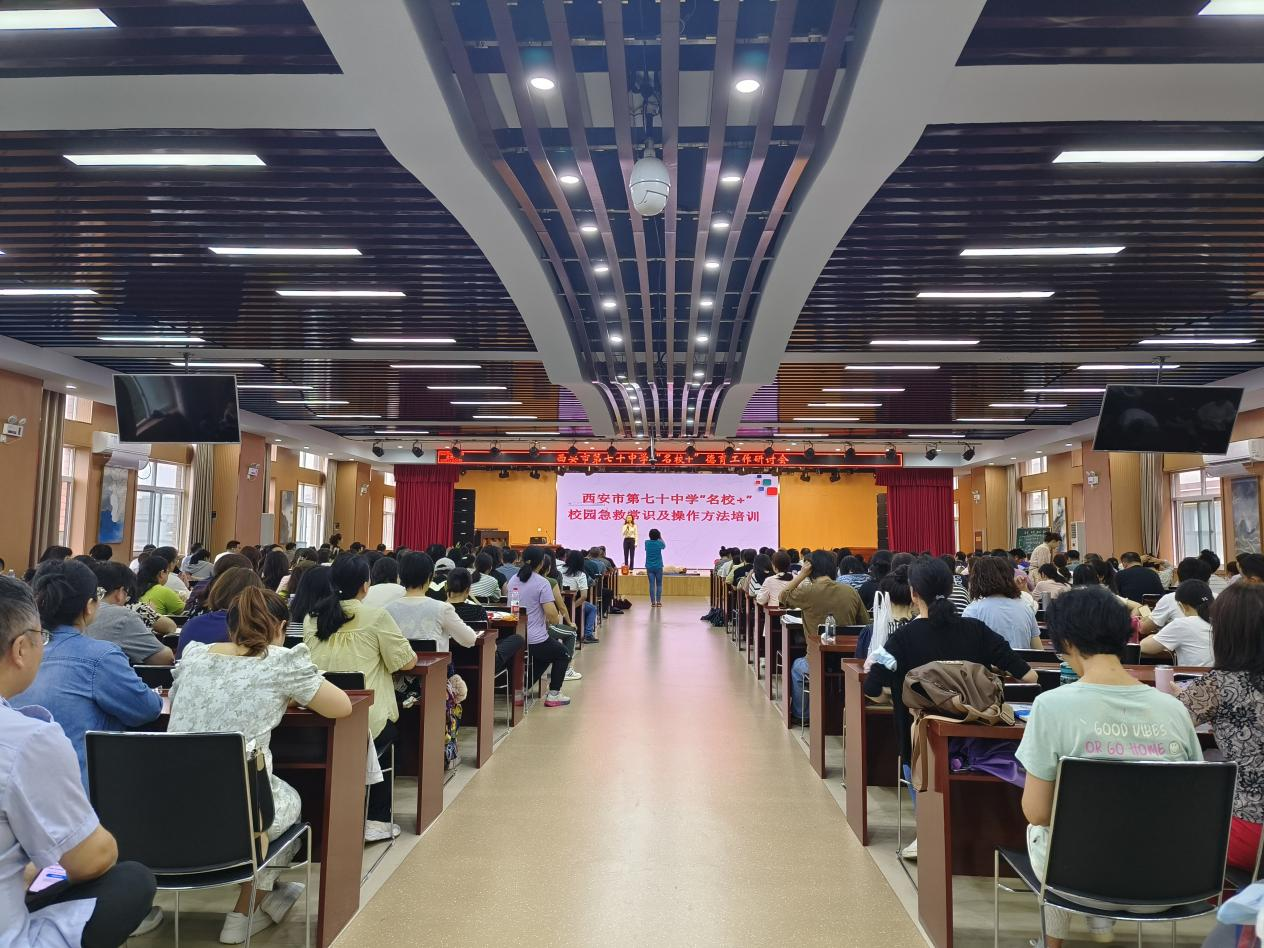开学前夕,莲湖区红十字会工作人员走进西安市第七十中学,为七十中“名校+”400余名教职员工普及“心肺复苏+AED”现场急救知识。