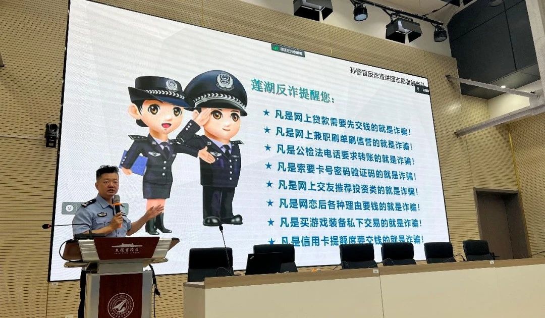 讲座现场,青年路派出所副所长孙静介绍了青年路派出所近年来在打击电诈工作中取得的成果,并通过以案释法、情景演绎等方式,对大学生群体中常见的“杀猪盘”、网络兼职刷单、校园贷、冒充电商物流客服诈骗、冒充公检法诈骗、游戏充值装备诈骗等骗局进行了细致剖析。孙静细致的防诈实例解析,让广大师生在生动活跃的氛围中学习到了如何识别防范电信诈骗。此外,他还向同学们普及了防诈骗“八个凡是”口诀,引导同学们将反诈口诀牢记于心,进一步构筑校园“反诈网”。讲座最后,孙静鼓励同学们加入反诈宣讲志愿服务队,为社会贡献出一份力量。