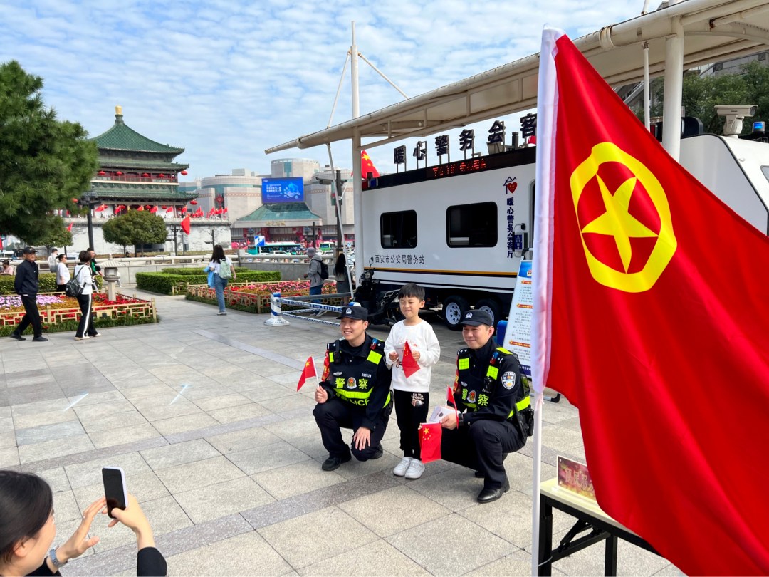 公安莲湖分局团委青年民警,在西安钟鼓楼广场、西大街沿线,开展“青春有信仰行动有担当”主题志愿服务周活动,面向广大市民及外地游客提供“发放手持国旗、讲解反诈知识、维护公共秩序、提供旅游咨询、环境卫生整治”等服务,推进全市政法机关服务高质量发展“两行动、两措施”及市局“三下”工程落地见效,成为了“双节”假期西安街头一道亮丽的风景线。