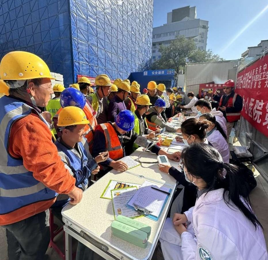 11月7日,来自西安市中心医院、莲湖区北大医院、青年路卫生服务中心的医护人员,走进青年路街道莲一社区辖区一处建筑工地,开展公益义诊,为城市建设者提供细致、暖心的医疗服务。