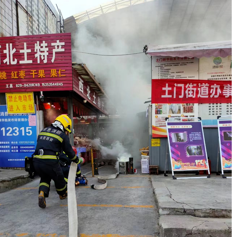 11月23日,莲湖区在土门街道新华市场举行消防应急演练,此次活动是莲湖区“百场安全宣传演练进基层”系列活动集贸市场专项演练。