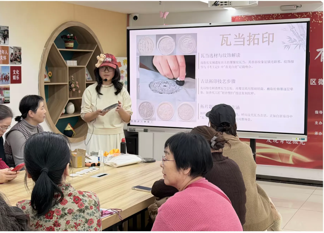 如果说唐诗是穿越时空的声音,那么拓印则是可触可感的文化印记。“长安有诗文明有你”系列活动走进西关街道新时代文明实践所、草阳社区等,在活动现场的手工体验环节中,居民们在指导老师的带领下,学习上纸、喷雾、捶打、着墨等步骤,亲手制作拓片。当覆盖的宣纸被轻轻揭开,“长乐未央”“延年益寿”的吉祥语,或朱雀、青龙等古朴灵动的纹样清晰浮现时,现场总会响起阵阵惊喜的赞叹。